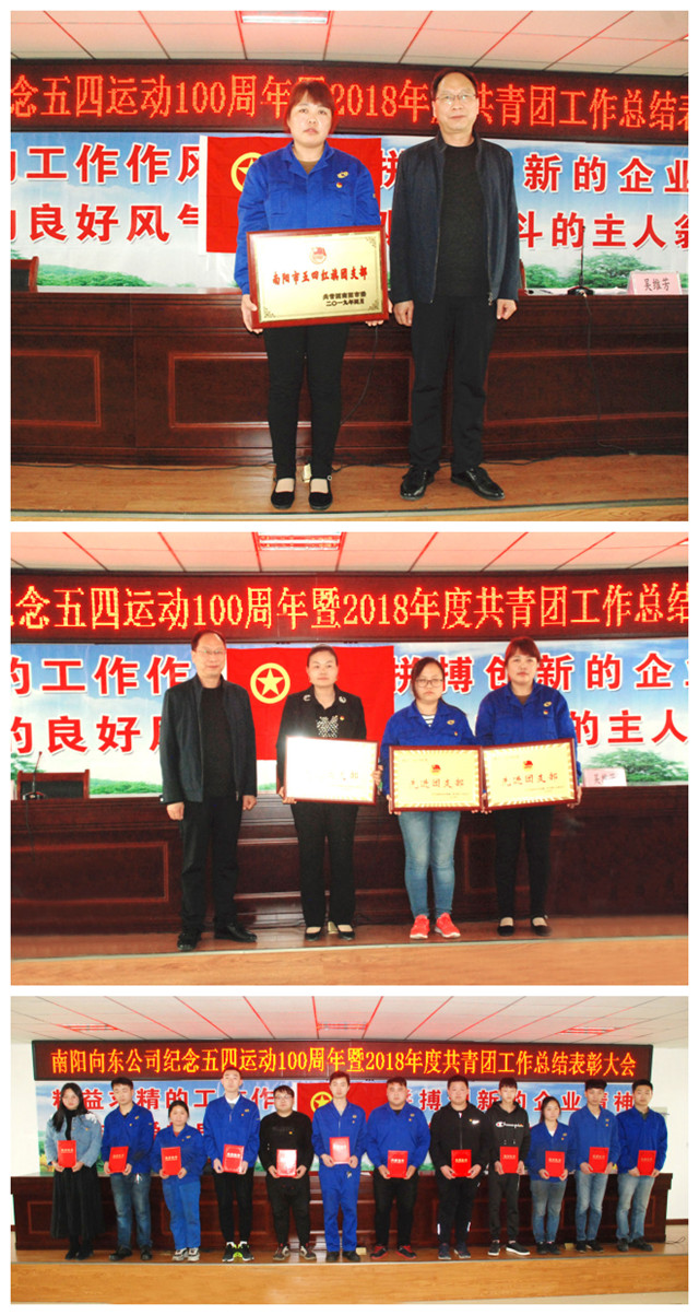 ? ? 大會授予河南向東機(jī)電設(shè)備有限公司團(tuán)支部等3個團(tuán)支部“先進(jìn)團(tuán)支部”稱號;授予林梟等15名同志“優(yōu)秀共青團(tuán)員”稱號;授予袁巖等10名同志“新長征突擊手”稱號;授予王靜等3名同志“優(yōu)秀共青團(tuán)干部”稱號;授予劉全義等2名同志“共青團(tuán)之友”稱號。其中,河南向東機(jī)電設(shè)備有限公司團(tuán)支部獲得共青團(tuán)南陽市委授予的“南陽市五四紅旗團(tuán)支部”榮譽(yù)稱號,林梟獲得共青團(tuán)南陽市委授予的“南陽市優(yōu)秀共青團(tuán)員”榮譽(yù)稱號。大會為獲獎的先進(jìn)集體和先進(jìn)個人頒發(fā)了榮譽(yù)證書。